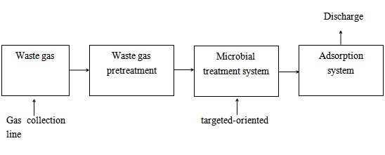 The main process flow of this technology is shown in Figure 1. The exhaust gas is collected and pretreated uniformly to filter out impurities such as suspended solids in the exhaust gas. At the same time, the gas is sterilized, to avoid the secondary microorganism contaminations of subsequent biological treatment unit; according to the type of exhaust gas and components customized microbial system, directional and efficient degradation of toxic and harmful components in the exhaust gas, after adsorption treatment, the gas discarded within the standards.