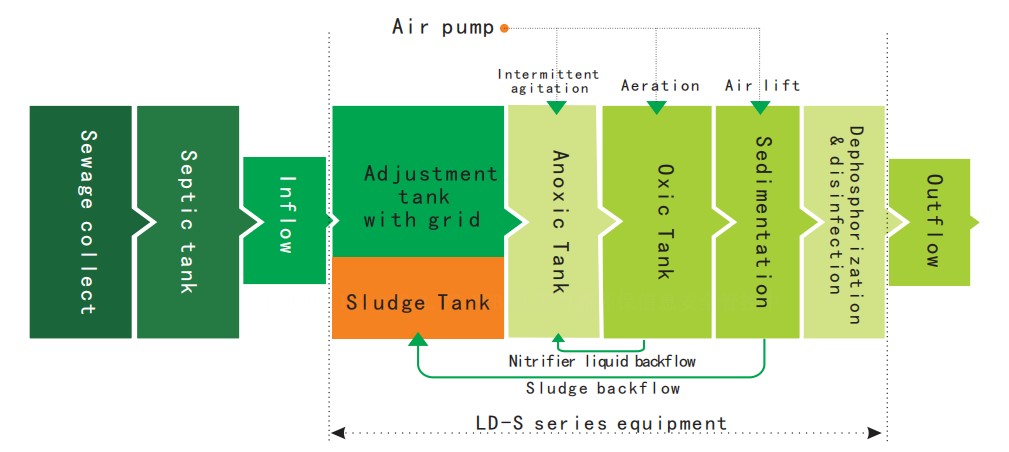 Process of AO technology:Domestic sewage Sewage is collected through the sewerage system;The sewage is discharged to the civil conditioning tank of the sewage treatment station;Solid contaminants are collected. LD-SC advanced treatment of sewage through PLC integrated automatic control lifting pump;Finally the wastewater is treated to the standard through anaerobic and aerobic biochemical reactions.