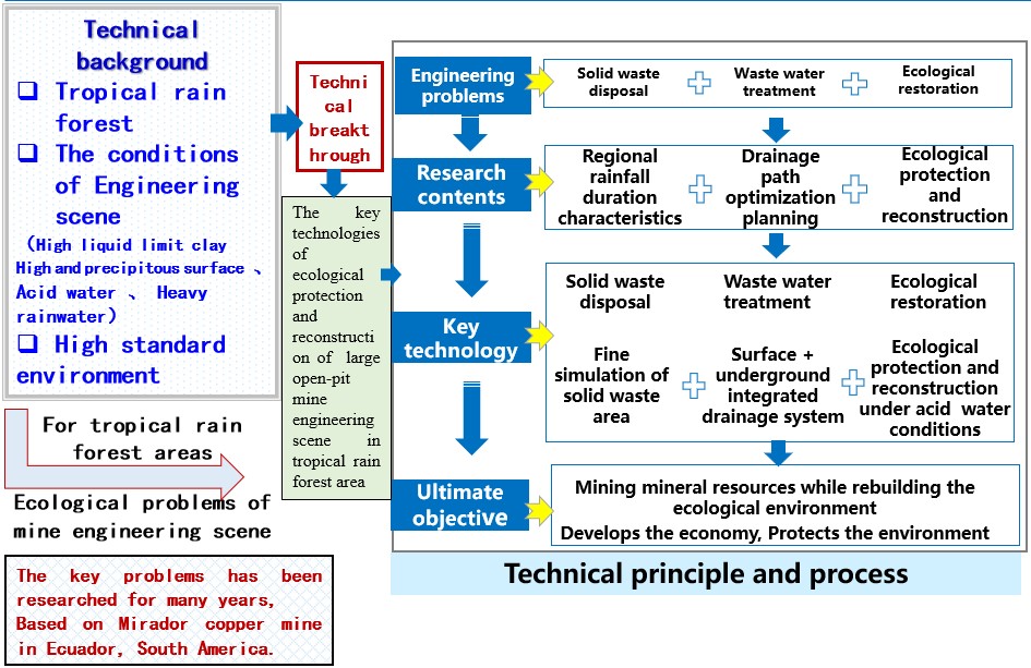 Aiming at the problem of ecological protection and reconstruction of large open-pit mine engineering scene in tropical rain forest area, based on Mirador copper mine in Ecuador, South America, analyze, study and construct the environmental damage and pollution factors of the engineering scene. Under the conditions of high environmental protection standards, dispose and treat the solid waste and wastewater produced in the engineering scene, focusing on the rainfall duration characteristics and the geometric structure of solid waste yard in rain forest area, According to the characteristics of rainfall duration and the refined geometric structure of solid waste yard, "a method to prevent the water scouring hazard at the junction of mine solid waste yard and mountain" is adopted to optimize the drainage path of clean water and sewage, centralized treatment and recycling of sewage (acid water), and ecological protection of solid waste yard based on sol spraying and grass planting; For the rich water slope of the engineering scene, "a collection and drainage system of fissure water gushing from easily weathered rock slope" is used for groundwater drainage, and "an integrated support carrier structure for ecological greening of steep slope" and "a support structure for greening of large open-pit mine slope" are used for ecological protection and reconstruction combined with spray seeding technology; Realize the purpose of mining mineral resources and rebuilding the ecological environment at the same time.
