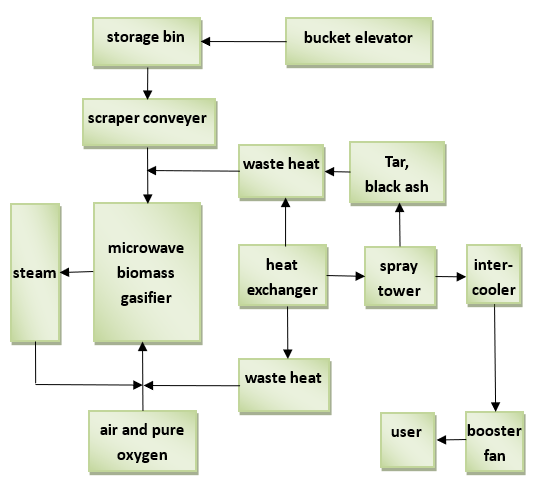 This project focuses on key technologies such as biomass solid waste processing into standard raw materials, oxygen-enriched coupled microwave physical field high-efficiency catalytic gasification, fluidized bed-fixed bed integration, steam-assisted high-efficiency gasification and fully-enclosed wet ash discharging, and develops a complete set of fixed-bed gasifier devices and supporting equipment with independent intellectual property rights, in which straw, chaff and waste wood are used as raw materials, and high-temperature cracking and microwave cracking are combined. The equipment has the advantages of high gasification efficiency, low tar content of fuel gas, etc. The produced combustible gas can be used in ceramic kilns and industrial boilers, and the generated ash and waste liquid can be prepared into soil improvers, organic fertilizers and building materials, respectively, with little environmental pollution. Related achievements passed the appraisal of scientific and technological achievements organized by China Machinery Industry Federation in Beijing in 2017, and its key technologies reached the international advanced level. The related technology has won 6 national invention patents.