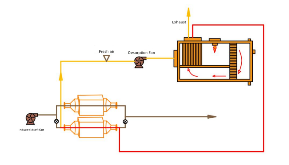 The process is as follows: heated gas → zeolite desorption → catalytic oxidation → fan → standard discharge. Part of the oxidized tail gas is discharged to the atmosphere, and part is recycled back to the zeolite box for desorption and regeneration of adsorbed materials.