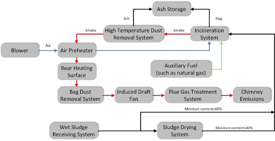 1. Independent incineration after semi-drying of municipal sludge, moisture content ≤ 40%, low calorific value ≥ 1000Kcal/Kg, independent incineration can be achieved without adding any auxiliary fuel;
